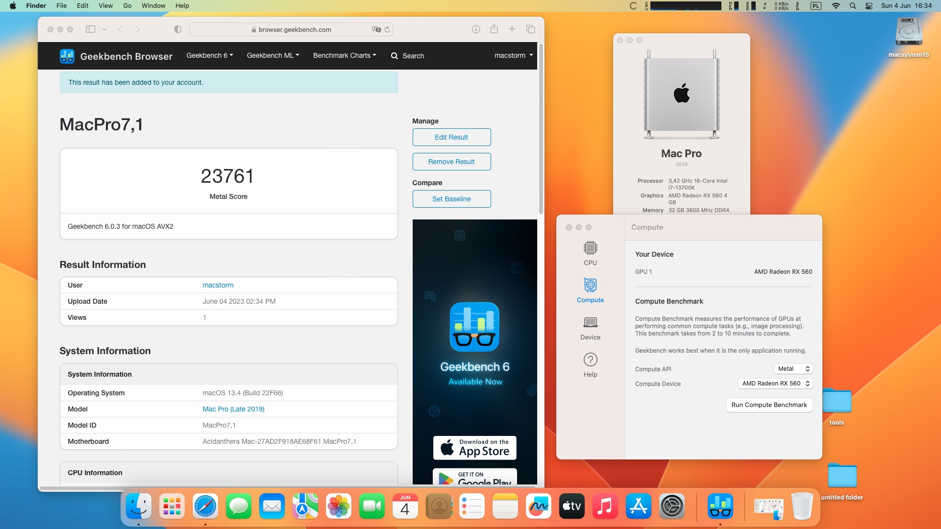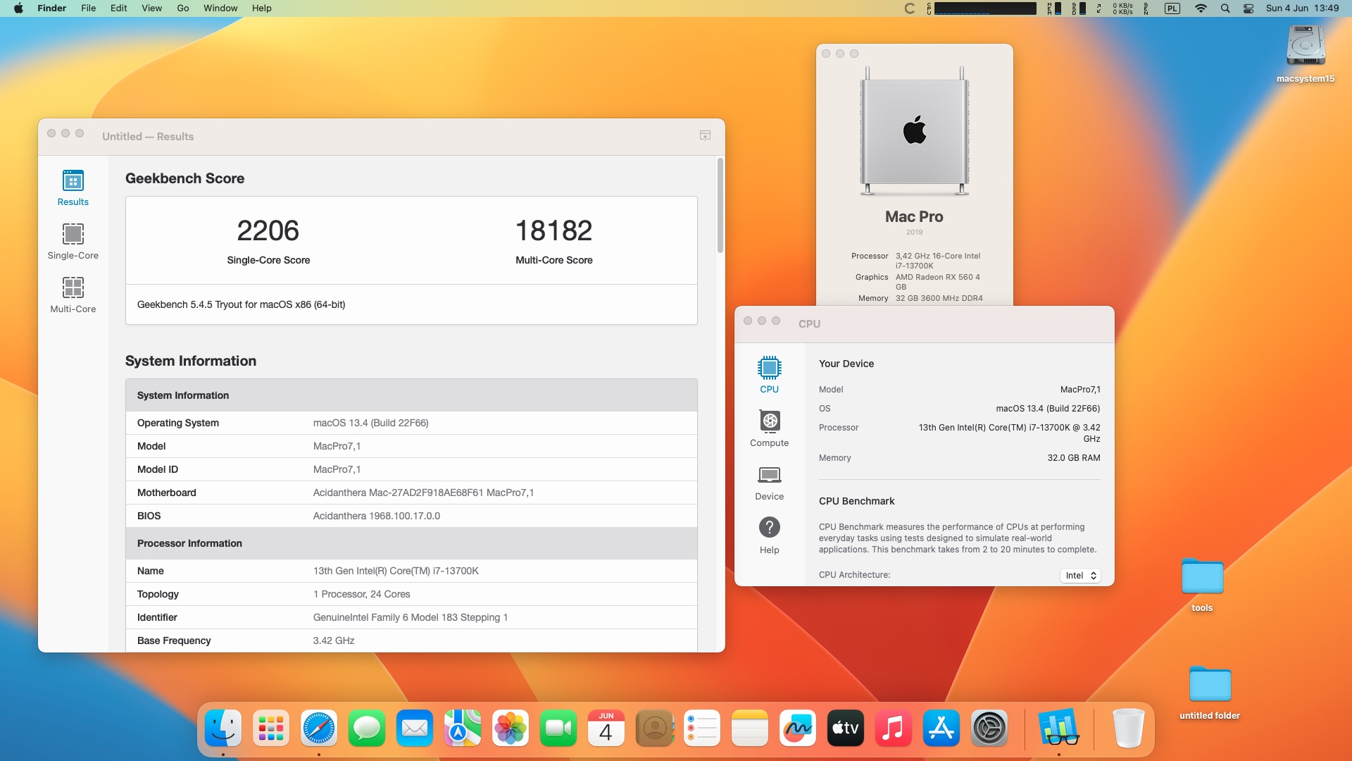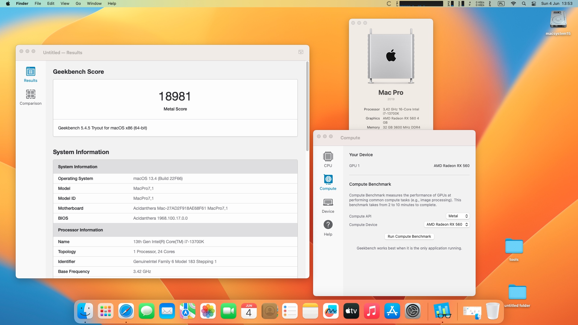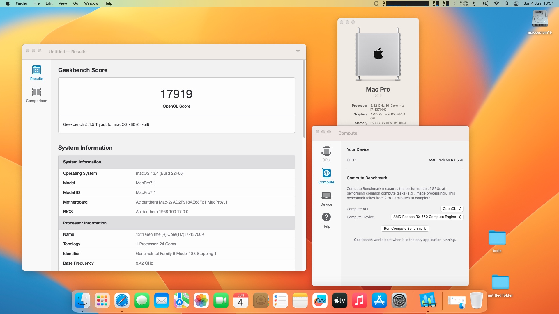 macOS Ventura 13.4. Procesor Intel Core i7-13700K 3.4 GHz 16 rdzeni .Pamięć 32 GB DDR4 3600 MHz .Grafika Radeon RX 560 4 GB.
