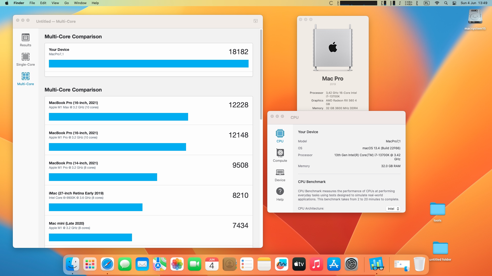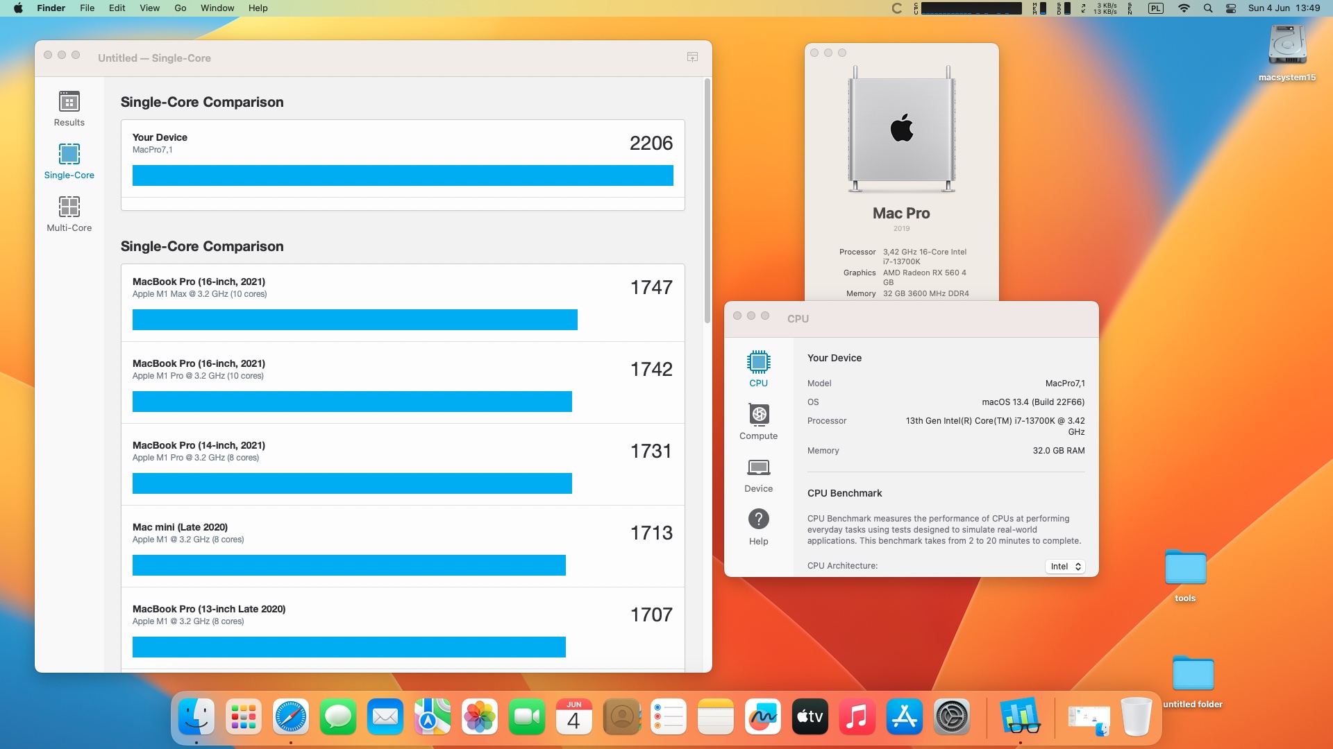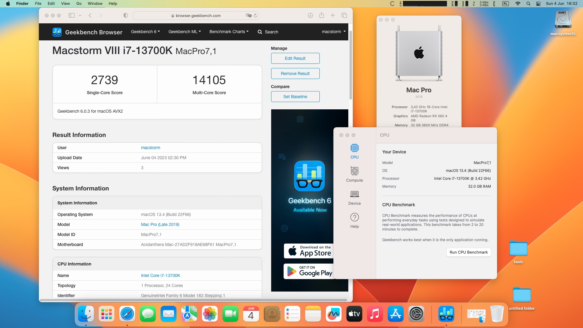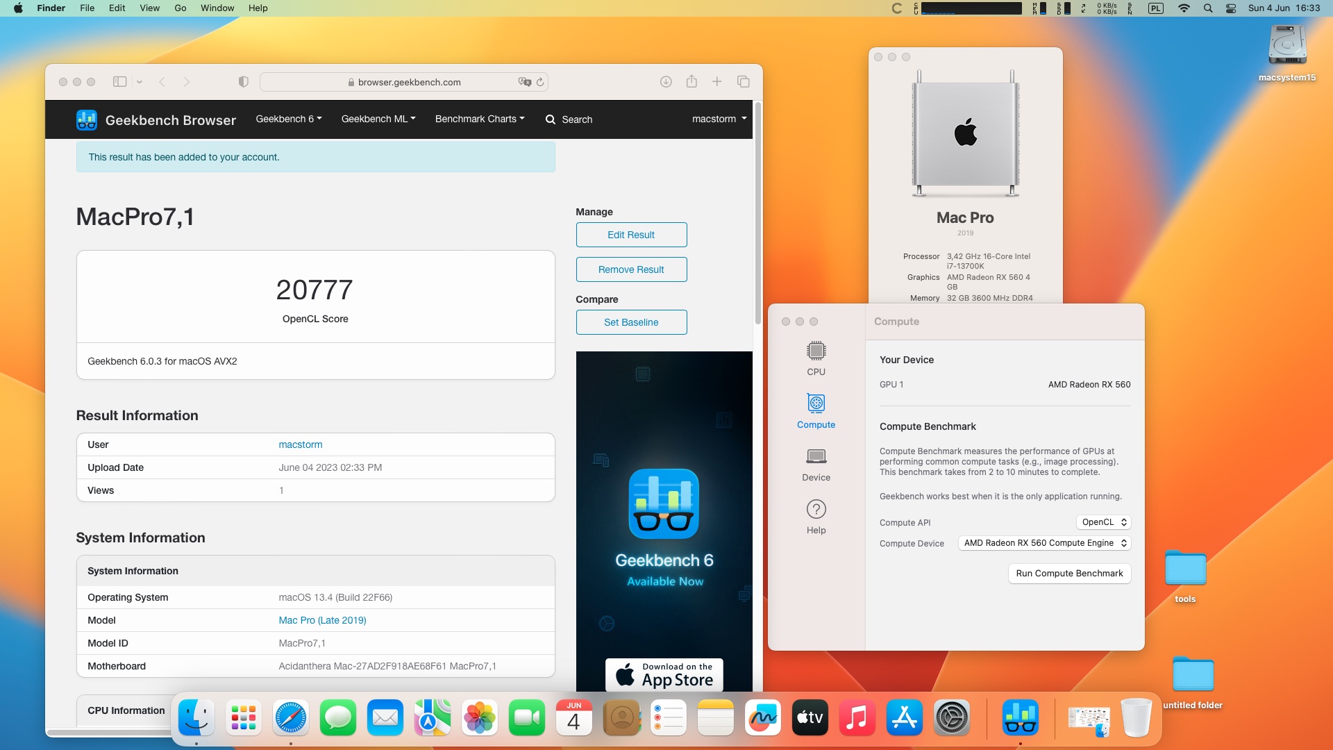 macOS Ventura 13.4. Procesor Intel Core i7-13700K 3.4 GHz 16 rdzeni .Pamięć 32 GB DDR4 3600 MHz .Grafika Radeon RX 560 4 GB.